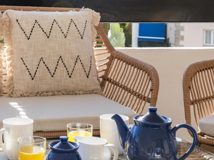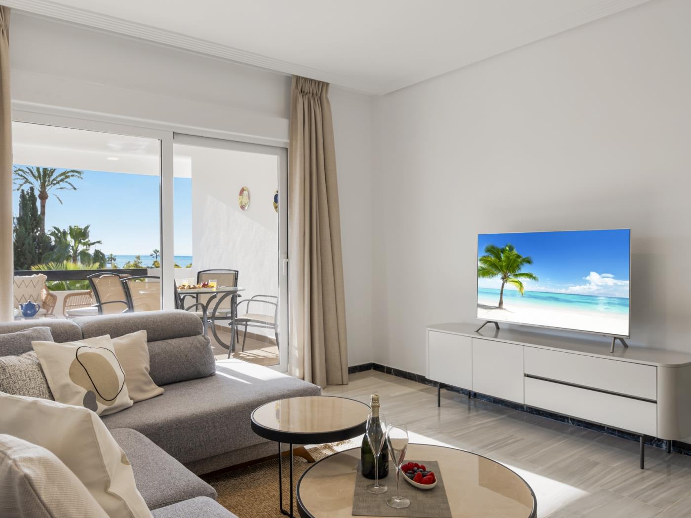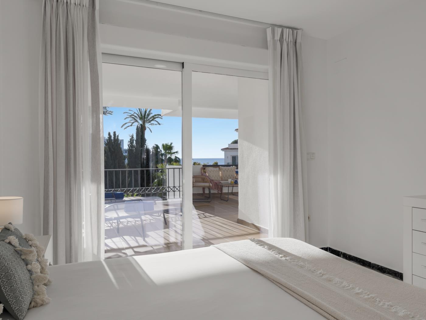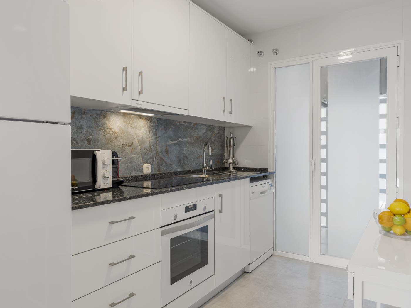 Cet appartement de 94 mètres carrés, situé au deuxième étage, offre une vue imprenable sur la Méditerranée. Il dispose d’une grande terrasse équipée de chaises longues, d’une salle à manger et d’une zone chill-out, parfaite pour se détendre et profiter des environs. L’intérieur comprend un grand salon-salle à manger, une cuisine indépendante entièrement équipée et une décoration simple avec des meubles blancs qui créent une atmosphère fraîche et accueillante.