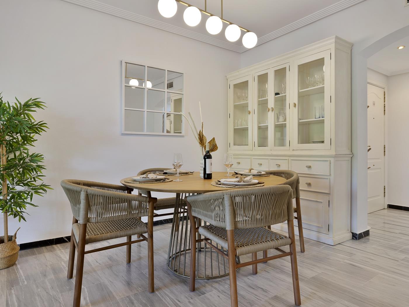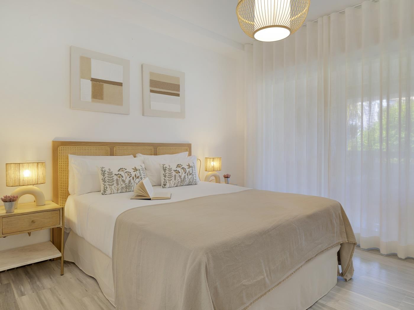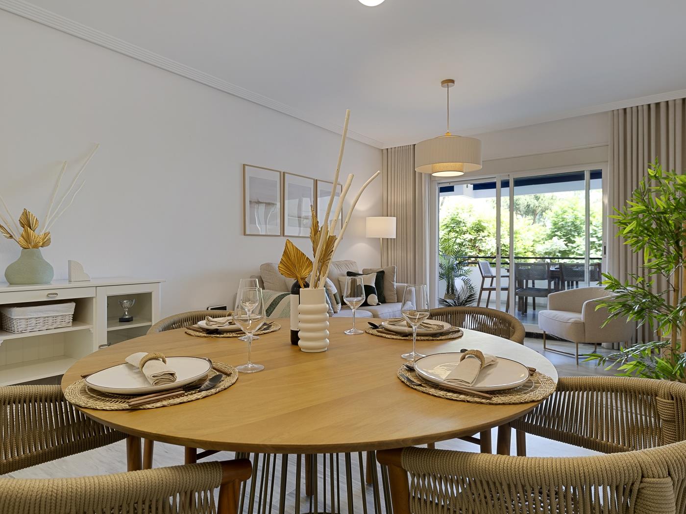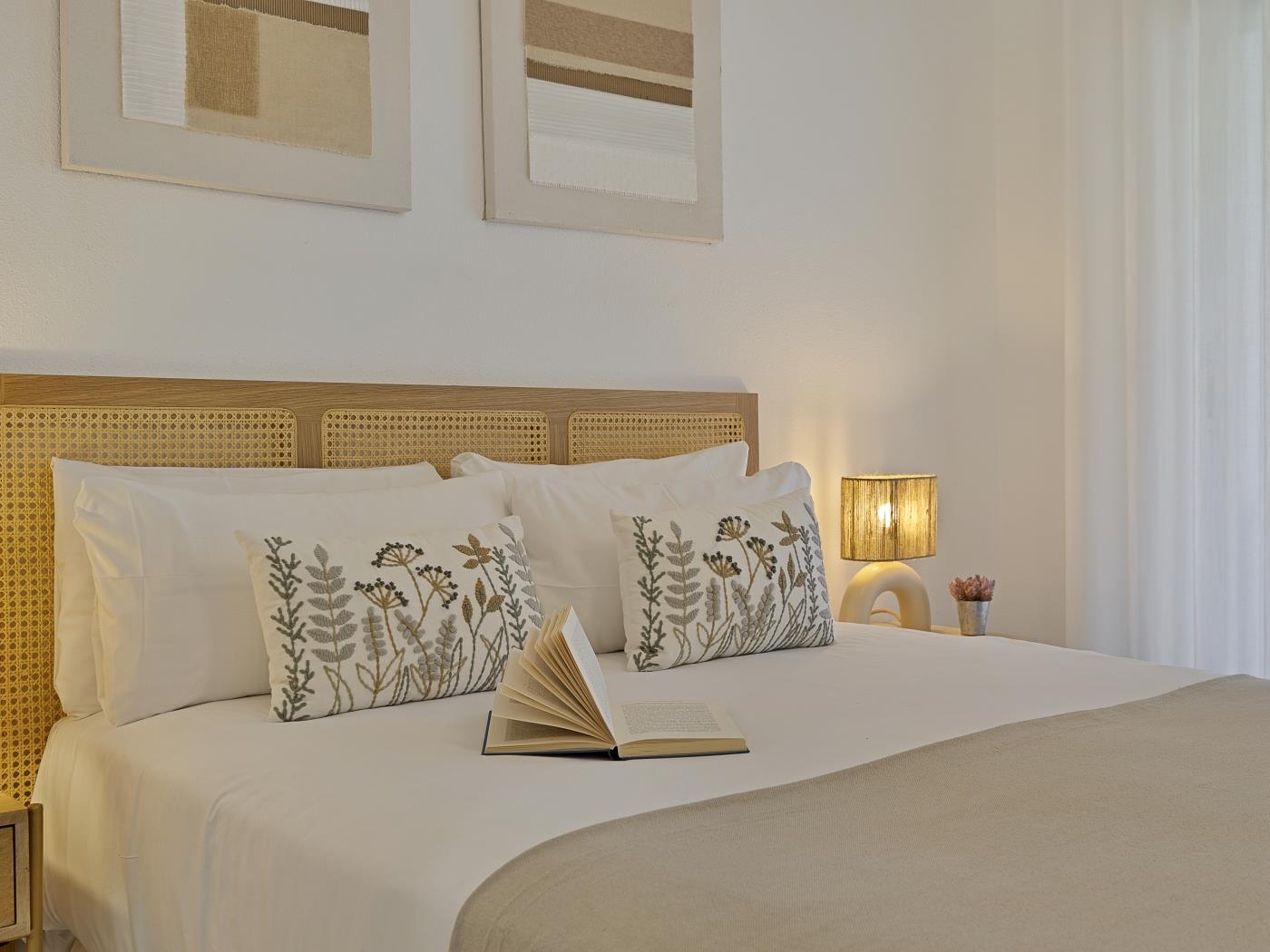 Cet appartement de 96 mètres carrés, situé au premier étage, dispose d’une spacieuse terrasse de 20 mètres carrés avec un coin repas et un salon extérieur, parfaits pour se détendre et profiter du paysage. L’intérieur comprend un salon-salle à manger spacieux et lumineux, une cuisine indépendante entièrement équipée et une décoration aux couleurs claires qui crée une ambiance chaleureuse.