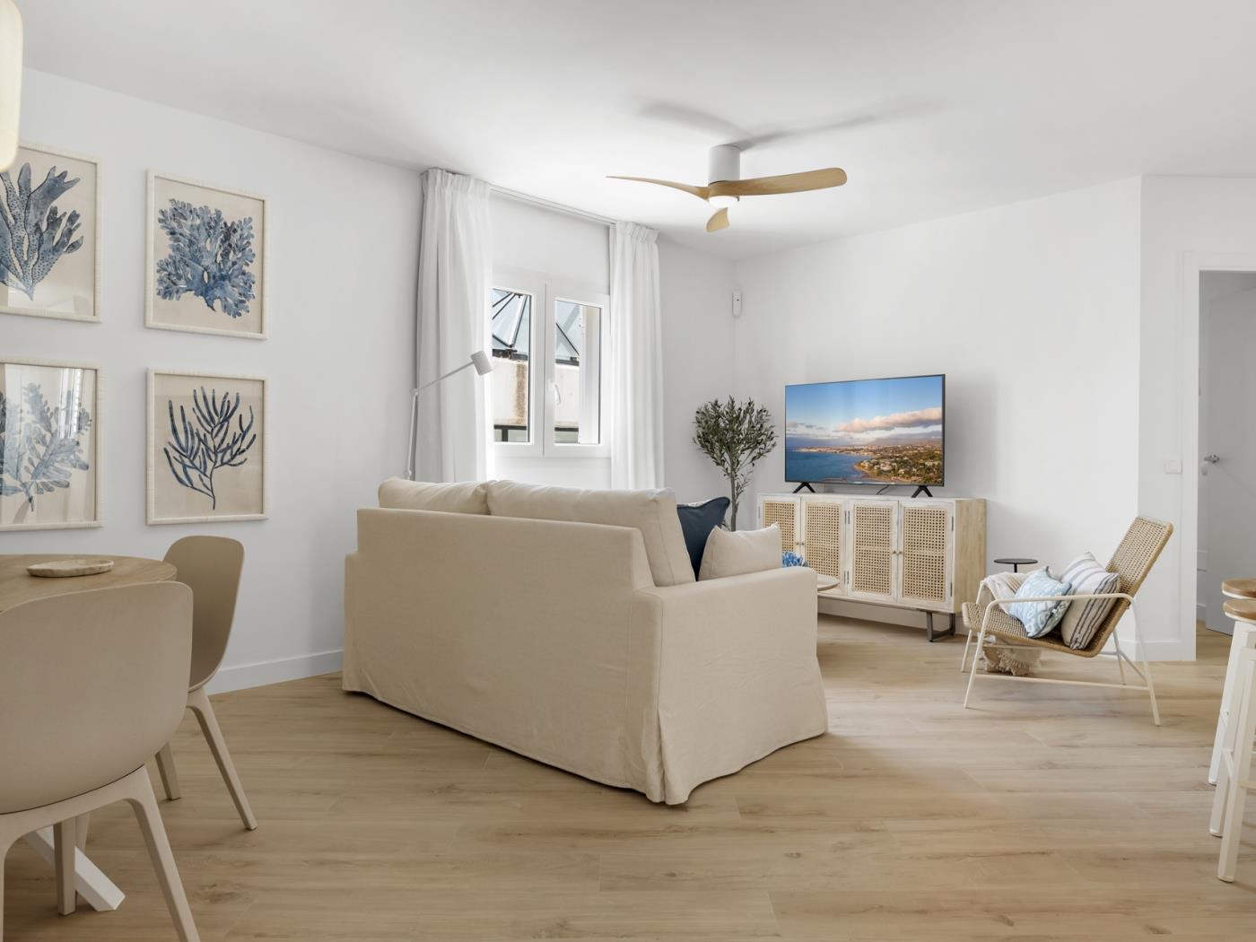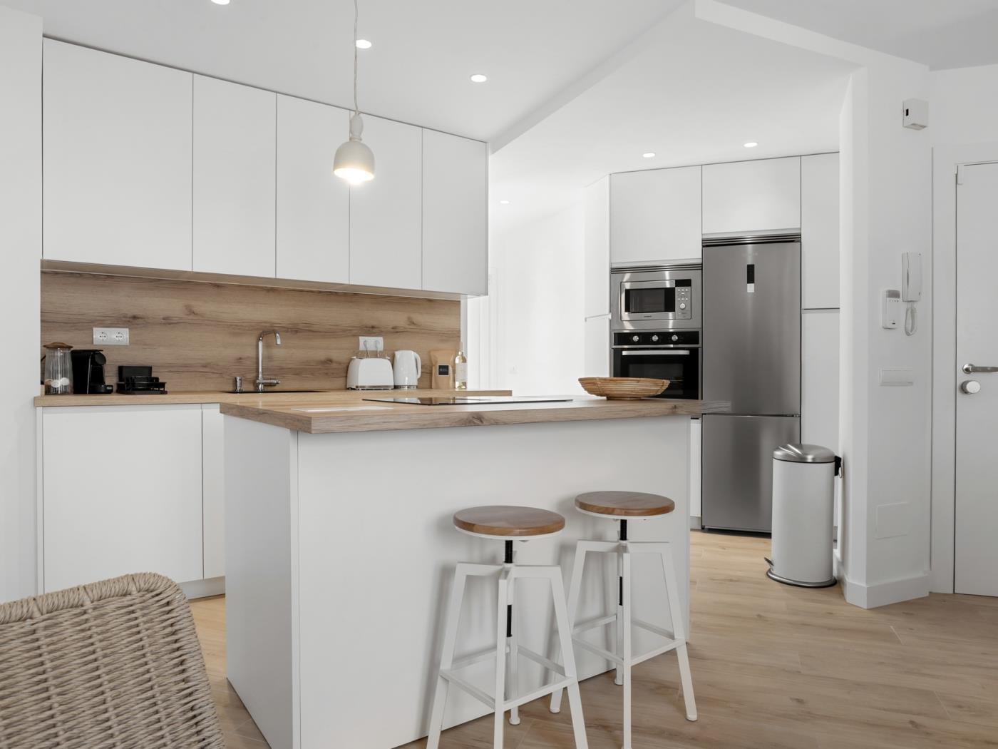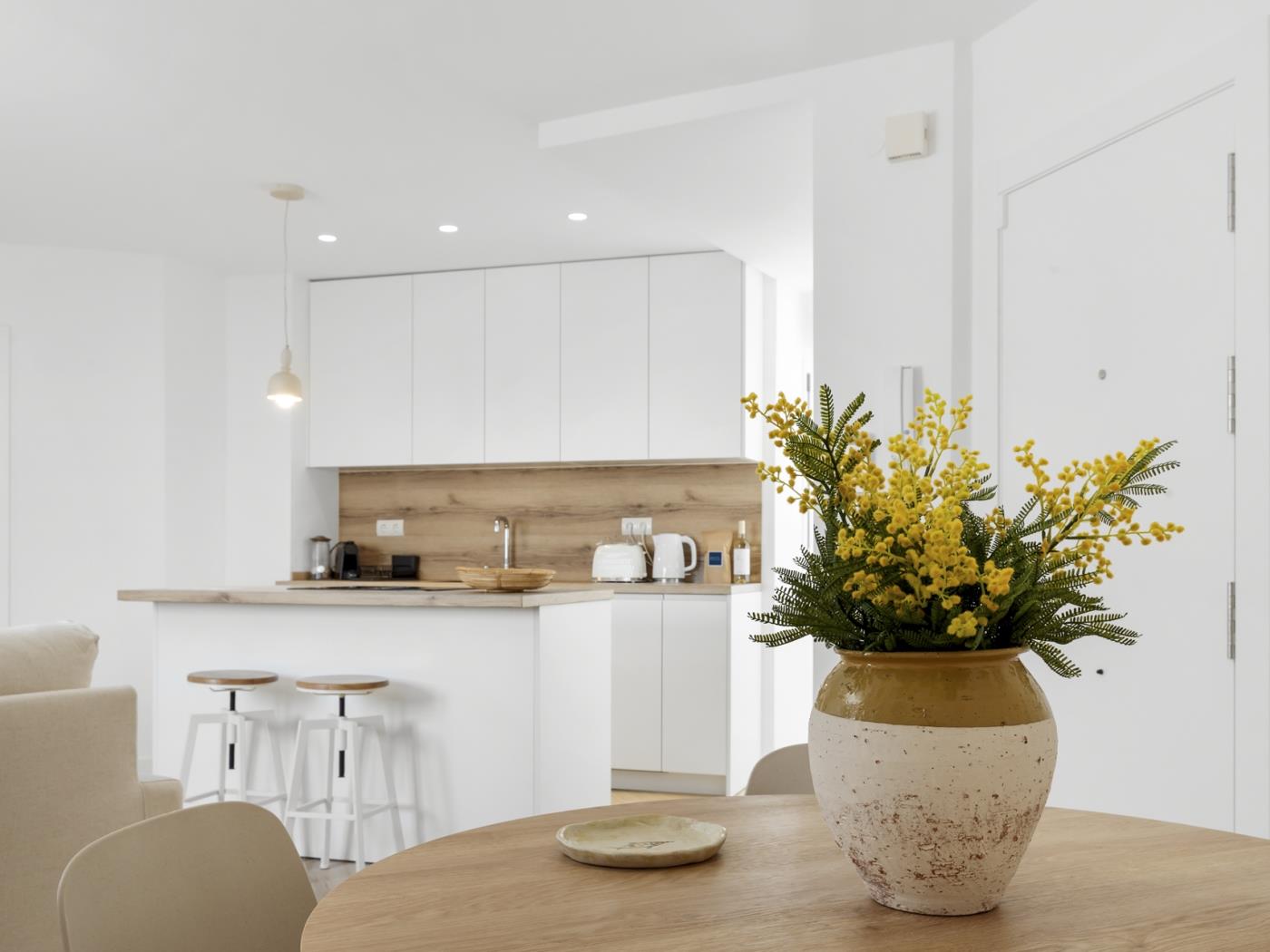Récemment rénové, l’appartement présente une décoration d’inspiration méditerranéenne, avec des tons neutres et des matériaux naturels qui apportent chaleur, fraîcheur et sérénité. L’espace de vie décloisonné relie harmonieusement la cuisine et le salon, créant un lieu confortable et fonctionnel – idéal pour se détendre après une journée ensoleillée ou explorer les environs animés.