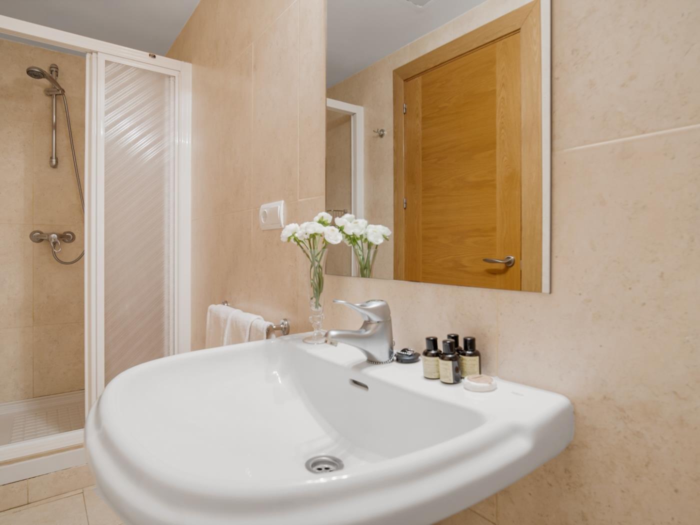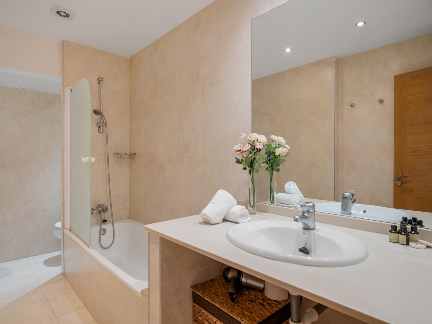 Avec une superficie de 97 mètres carrés, cet appartement situé au troisième étage dispose d’un salon-salle à manger spacieux et lumineux avec accès direct à une terrasse ensoleillée. La cuisine entièrement équipée complète l’intérieur moderne et accueillant. L’appartement dispose de deux chambres, chacune avec un lit double, et de deux salles de bains complètes, garantissant un séjour confortable pour tous les invités.