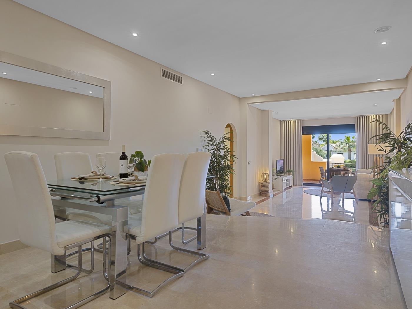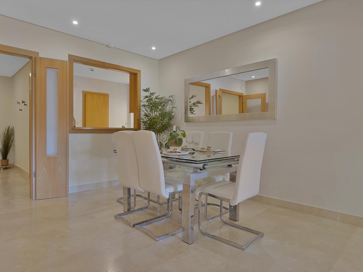 Cet appartement spacieux de 164 m² dispose de deux grandes chambres et de deux salles de bains complètes. La propriété comprend une grande terrasse avec un coin repas et des chaises longues, parfait pour profiter du climat de la Costa del Sol. La décoration moderne et élégante du salon, qui comprend également une salle à manger pour six personnes, offre une atmosphère chaleureuse et sophistiquée.