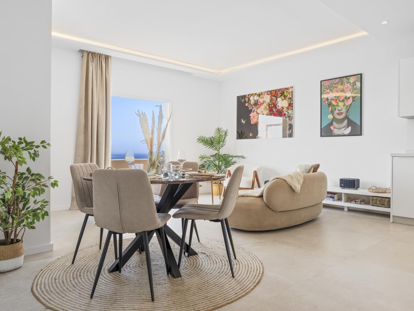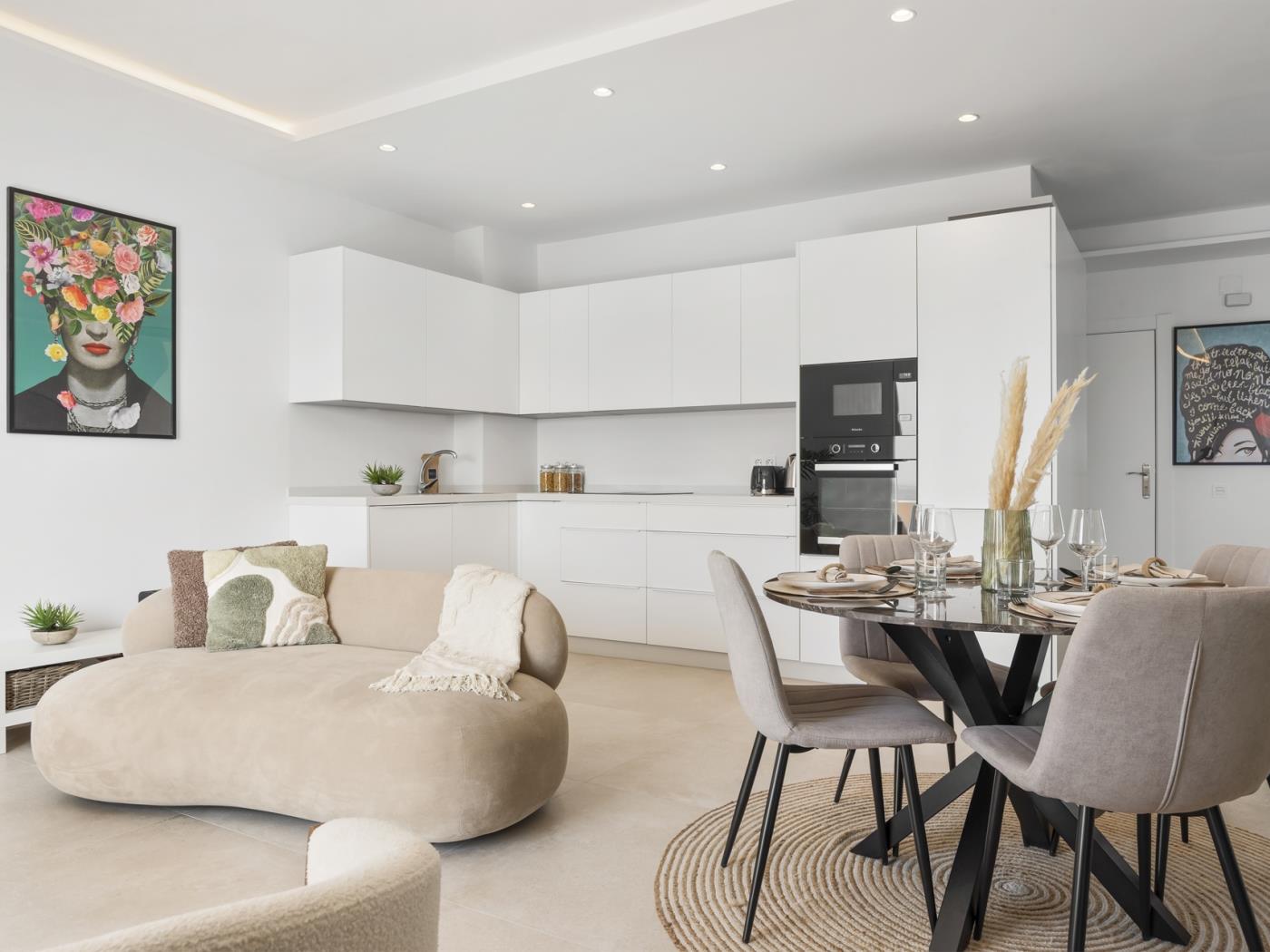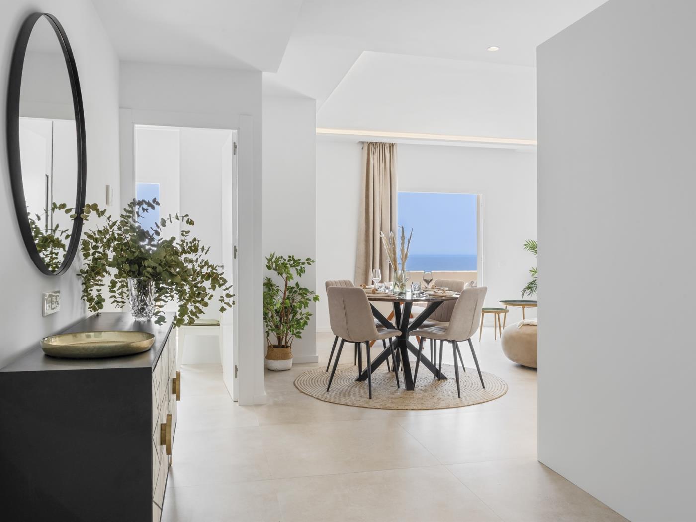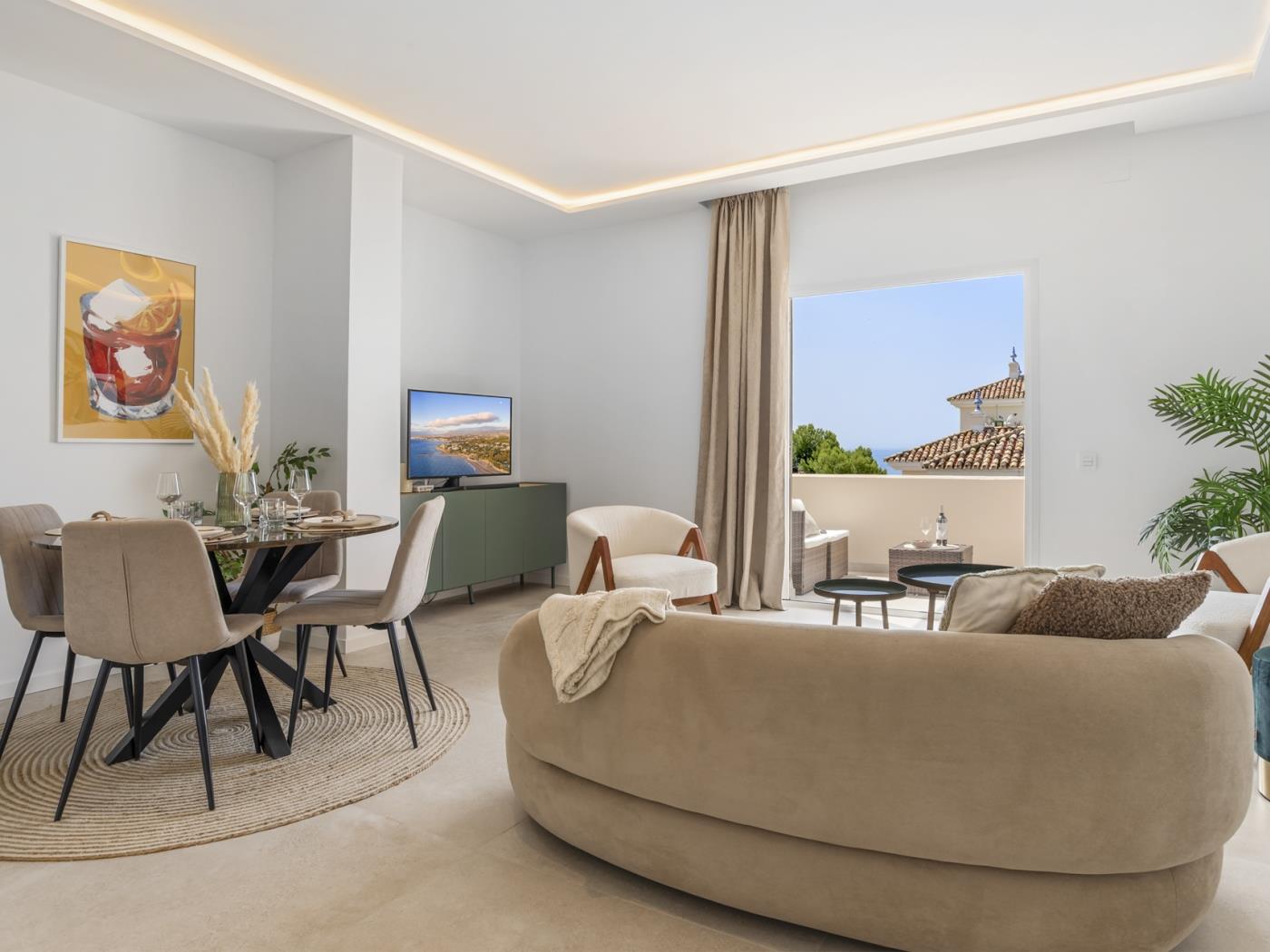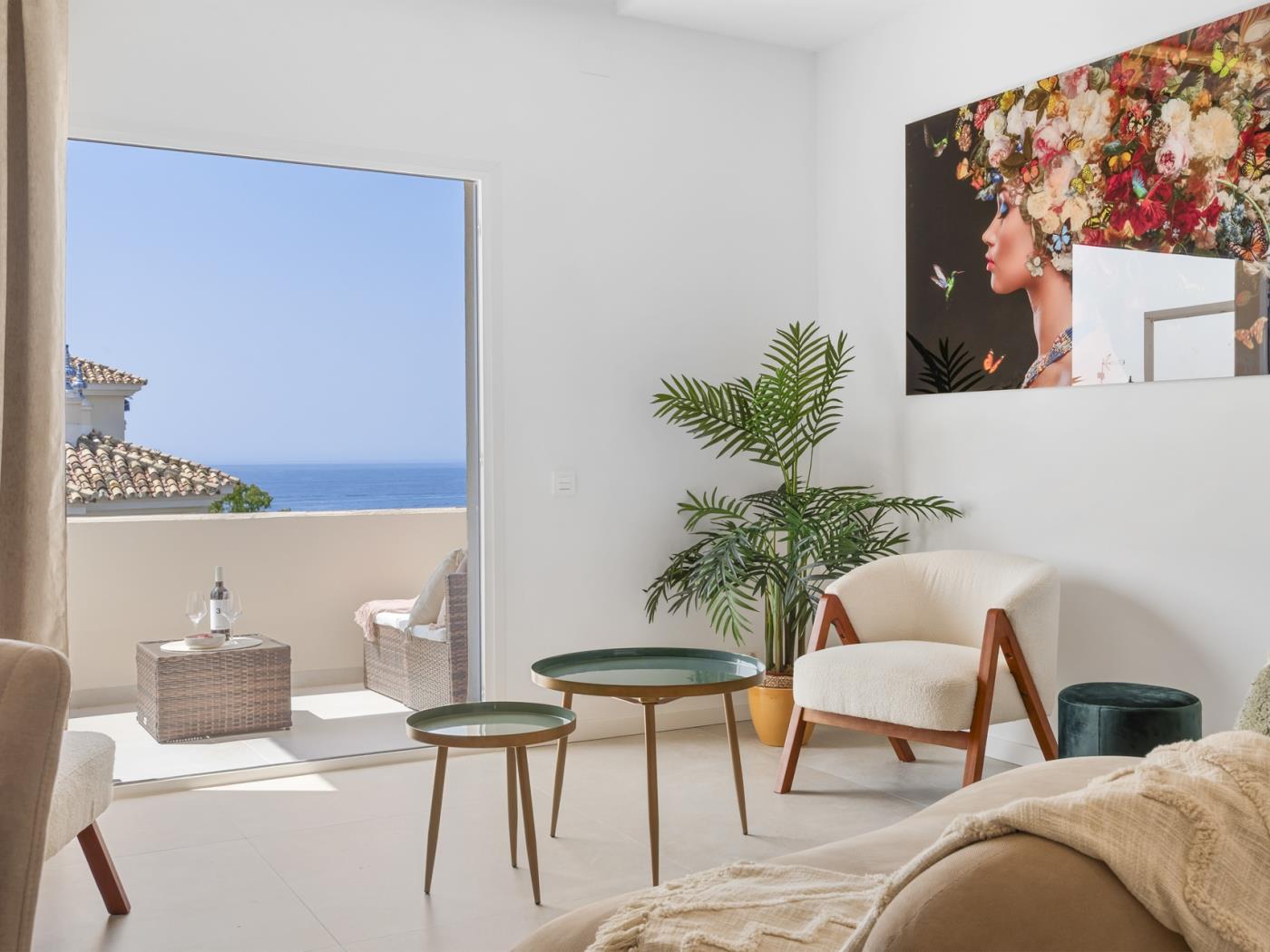 L’appartement offre un salon lumineux avec cuisine ouverte, parfaitement aménagé, qui s’ouvre sur une terrasse exposée sud, idéale pour profiter du climat ensoleillé de la Costa del Sol et de superbes vues sur le jardin et la mer.
