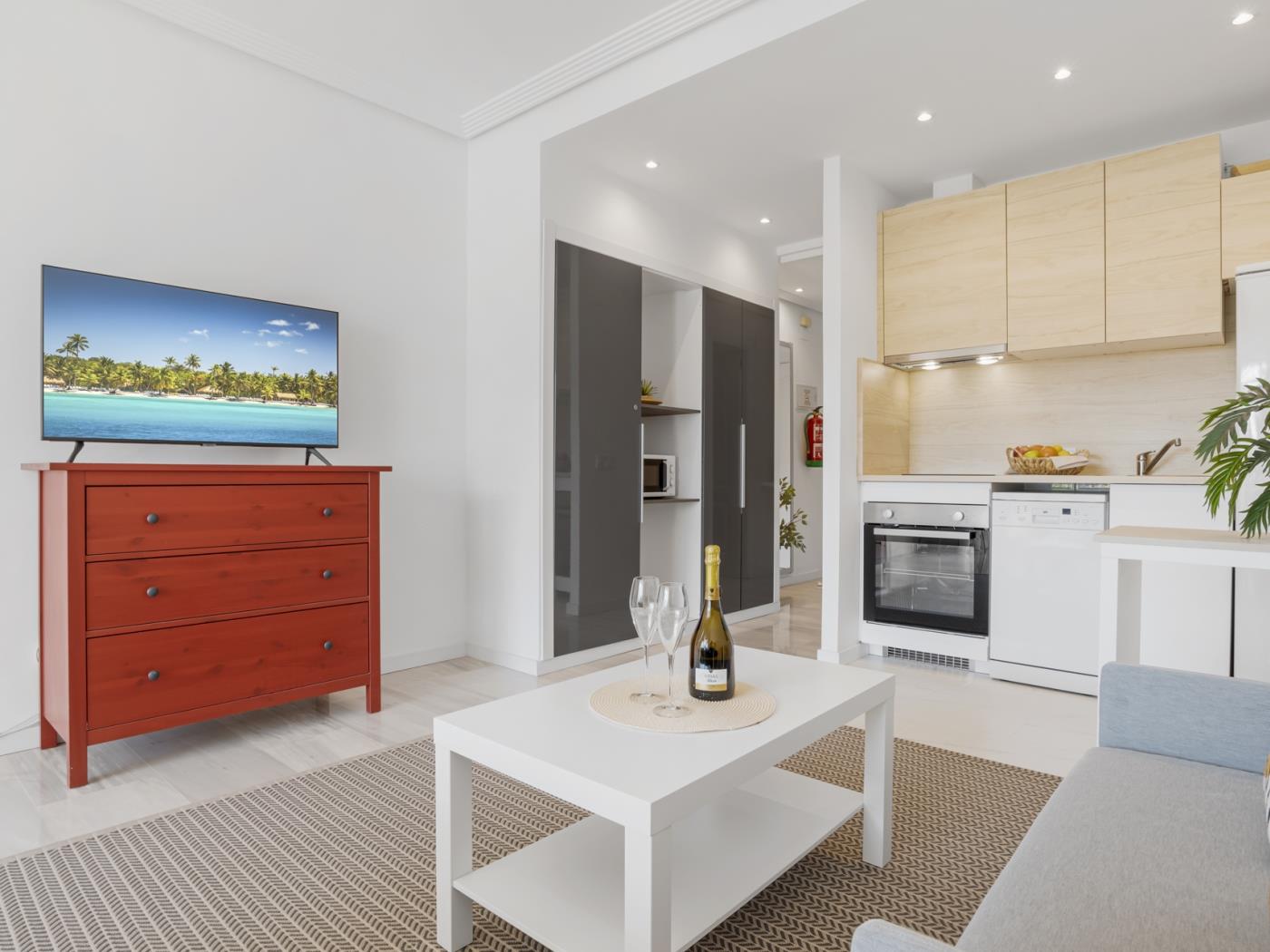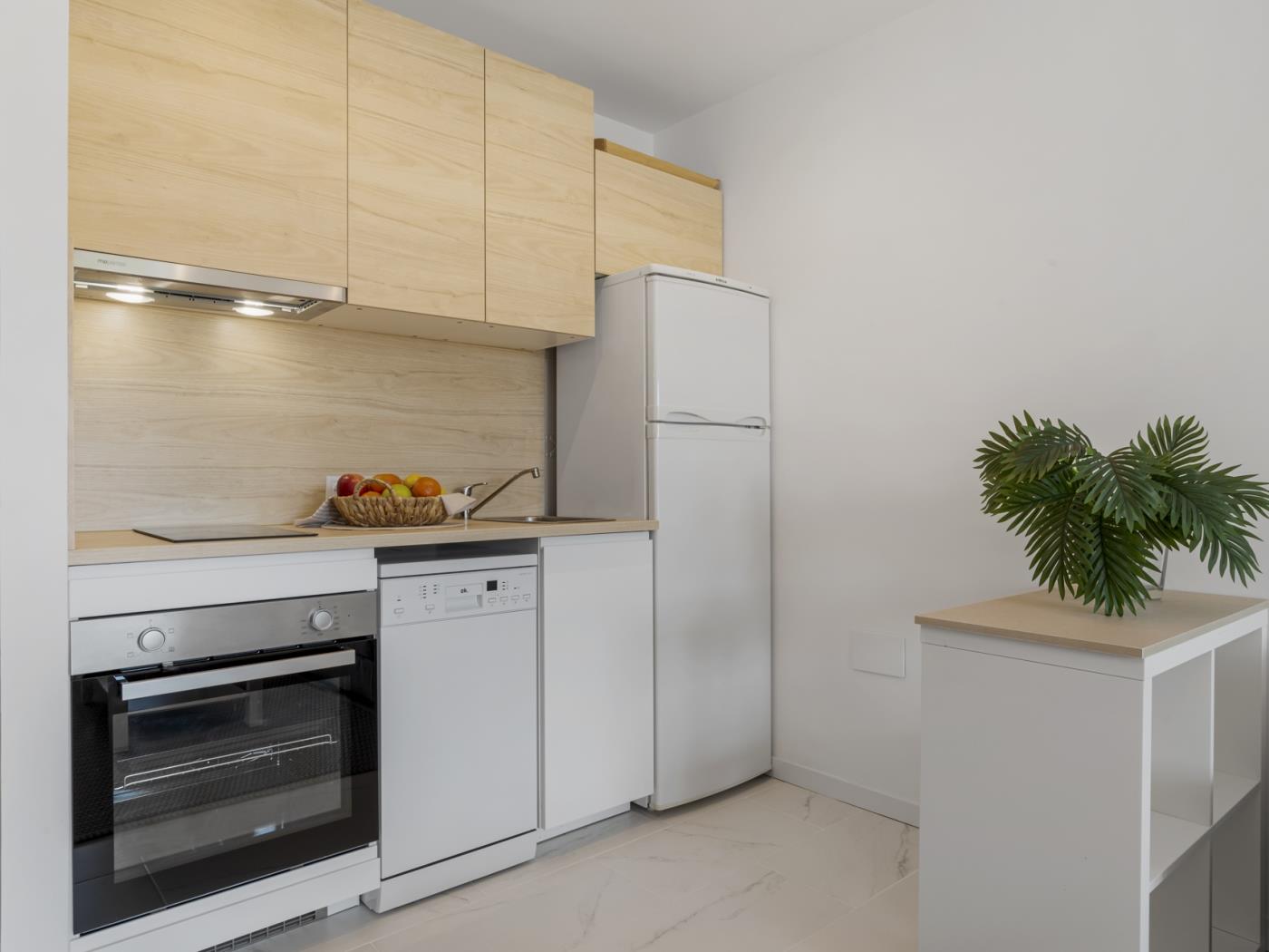Le studio de 45 mètres carrés, avec une cuisine indépendante et un espace ouvert comprenant un canapé et un lit double, dispose d’une terrasse offrant une vue sur la mer. Idéal pour les couples qui apprécient le confort et la fonctionnalité dans un espace proche de tous les services.