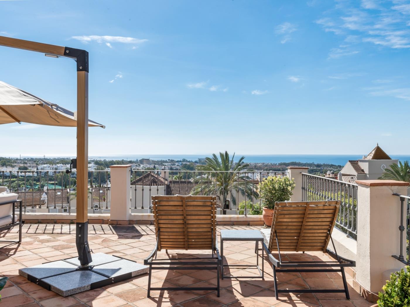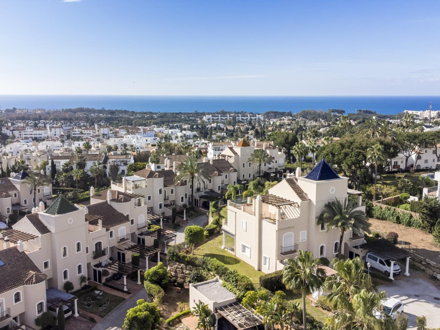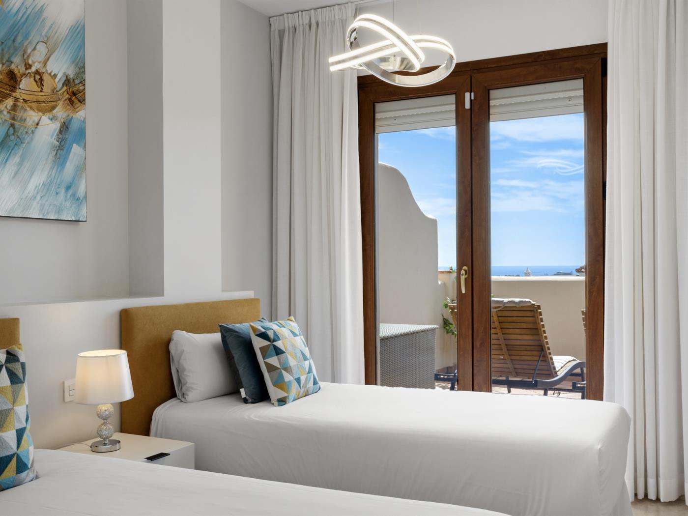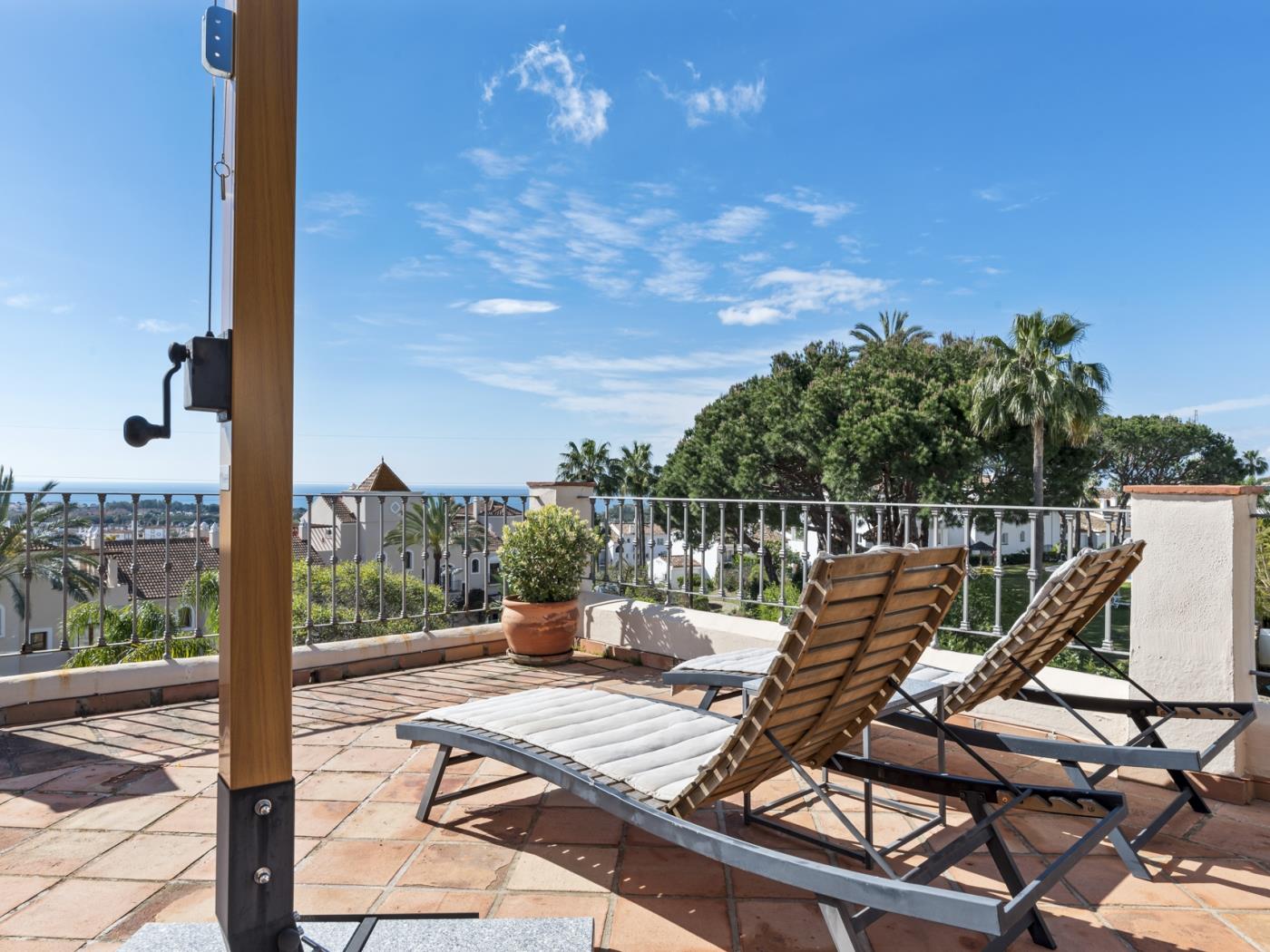 La maison peut accueillir confortablement jusqu’à six personnes, réparties dans trois grandes chambres avec salle de bain privative, ainsi qu’un salon sous combles équipé d’un canapé-lit, idéal pour un adulte ou deux enfants. Chaque pièce est décorée avec un goût contemporain et des tons neutres qui invitent à la détente. Les terrasses privées et les espaces extérieurs offrent un cadre privilégié pour profiter du climat doux de la Costa del Sol tout au long de l’année.