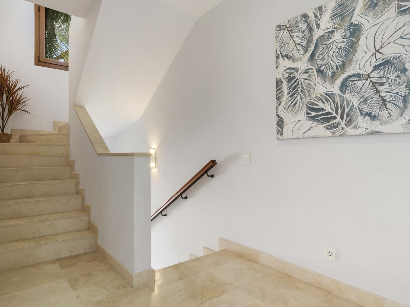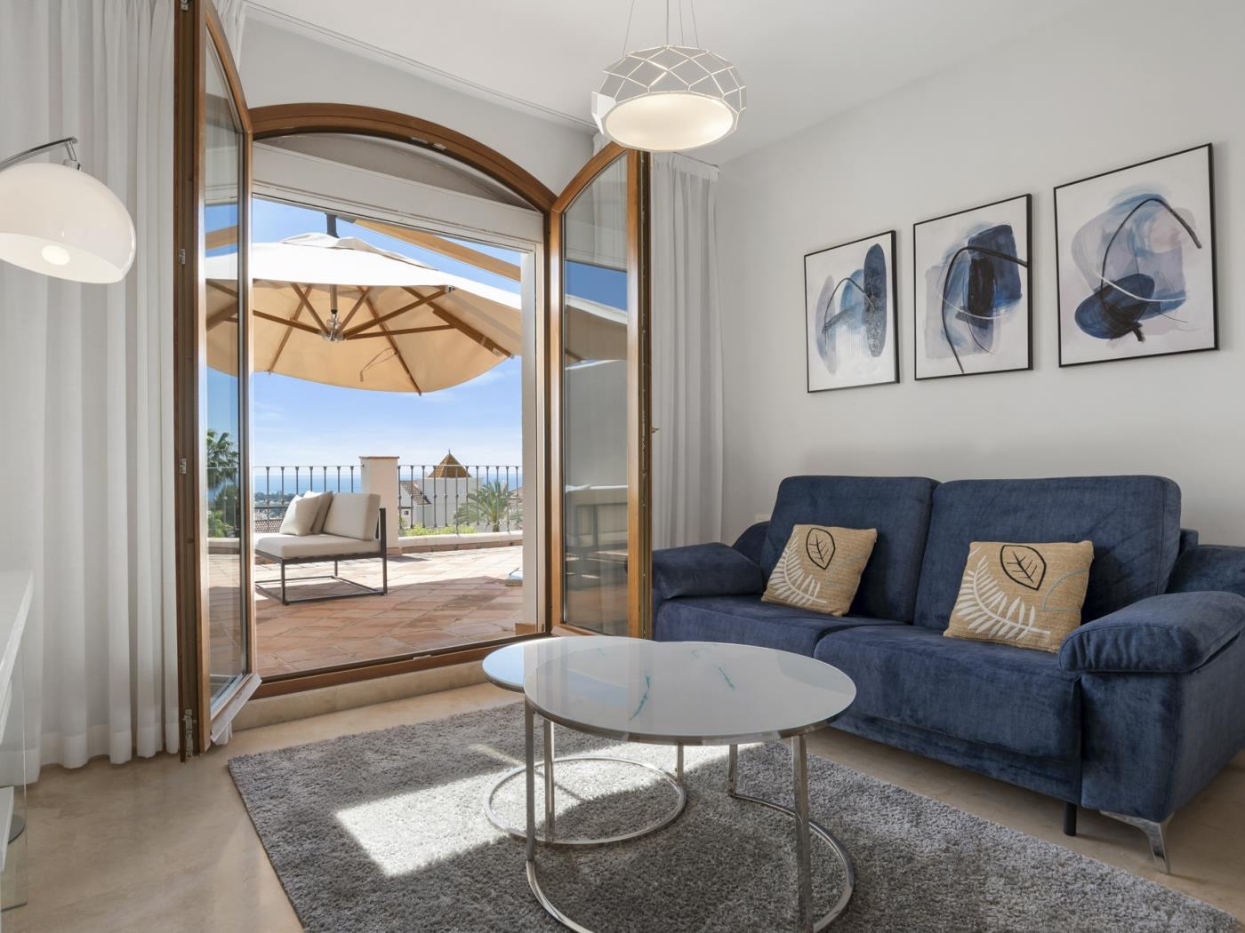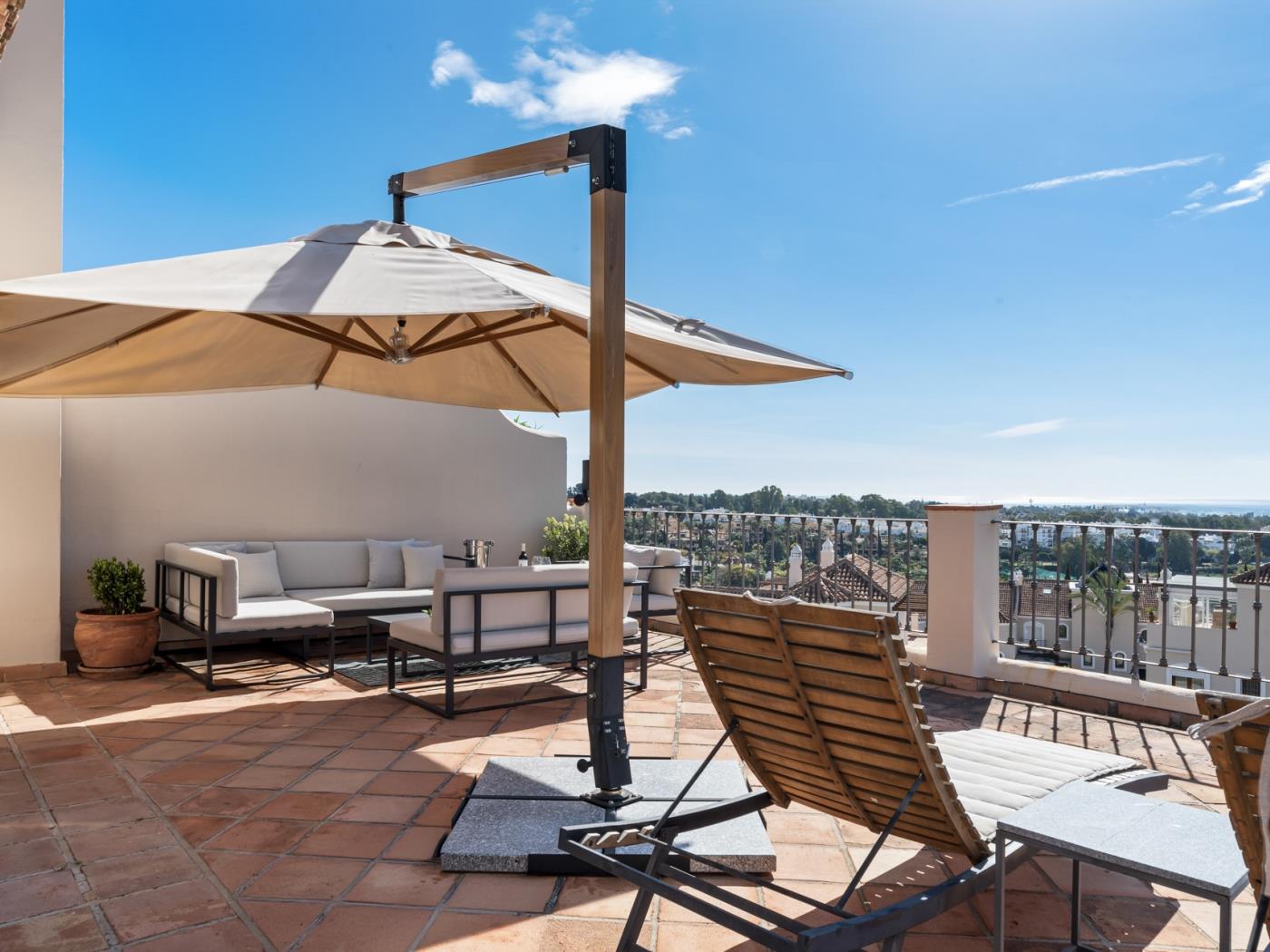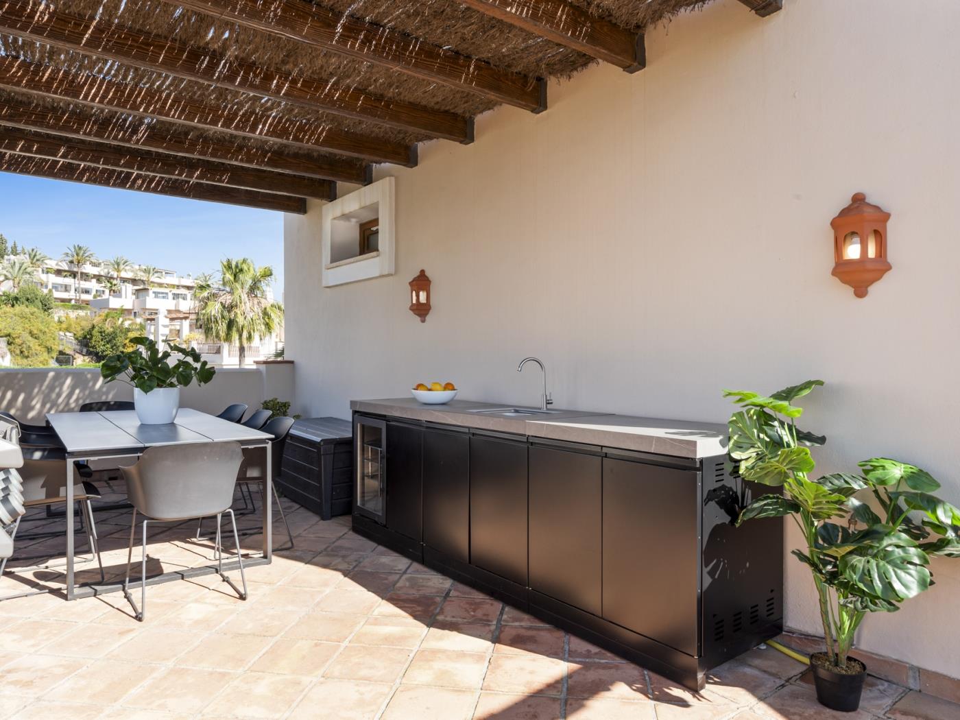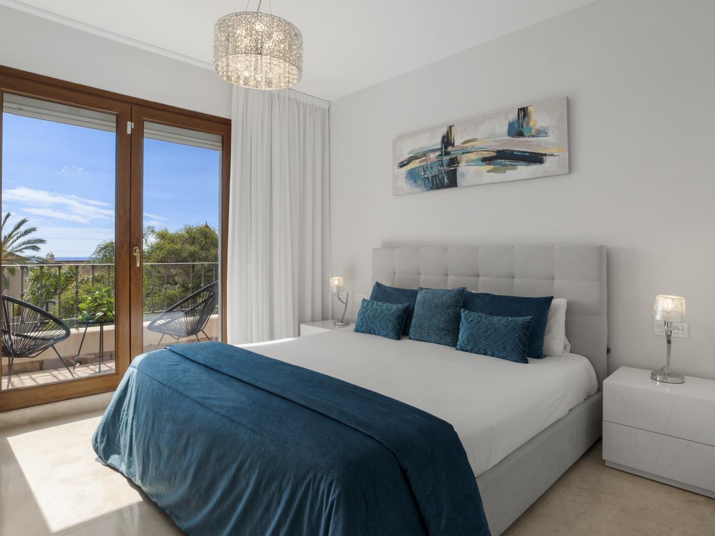 La maison peut accueillir confortablement jusqu’à six personnes, réparties dans trois grandes chambres avec salle de bain privative, ainsi qu’un salon sous combles équipé d’un canapé-lit, idéal pour un adulte ou deux enfants. Chaque pièce est décorée avec un goût contemporain et des tons neutres qui invitent à la détente. Les terrasses privées et les espaces extérieurs offrent un cadre privilégié pour profiter du climat doux de la Costa del Sol tout au long de l’année.