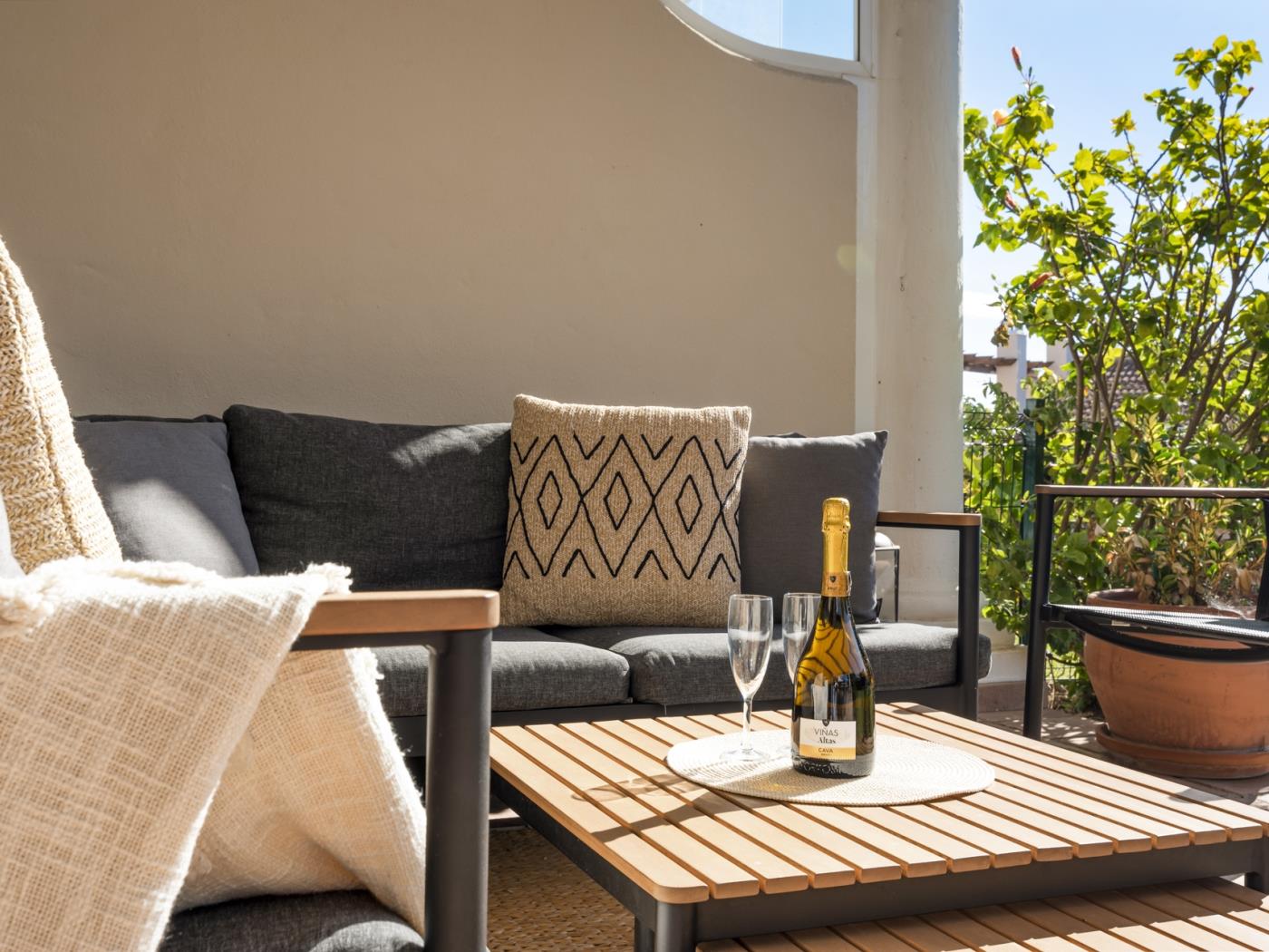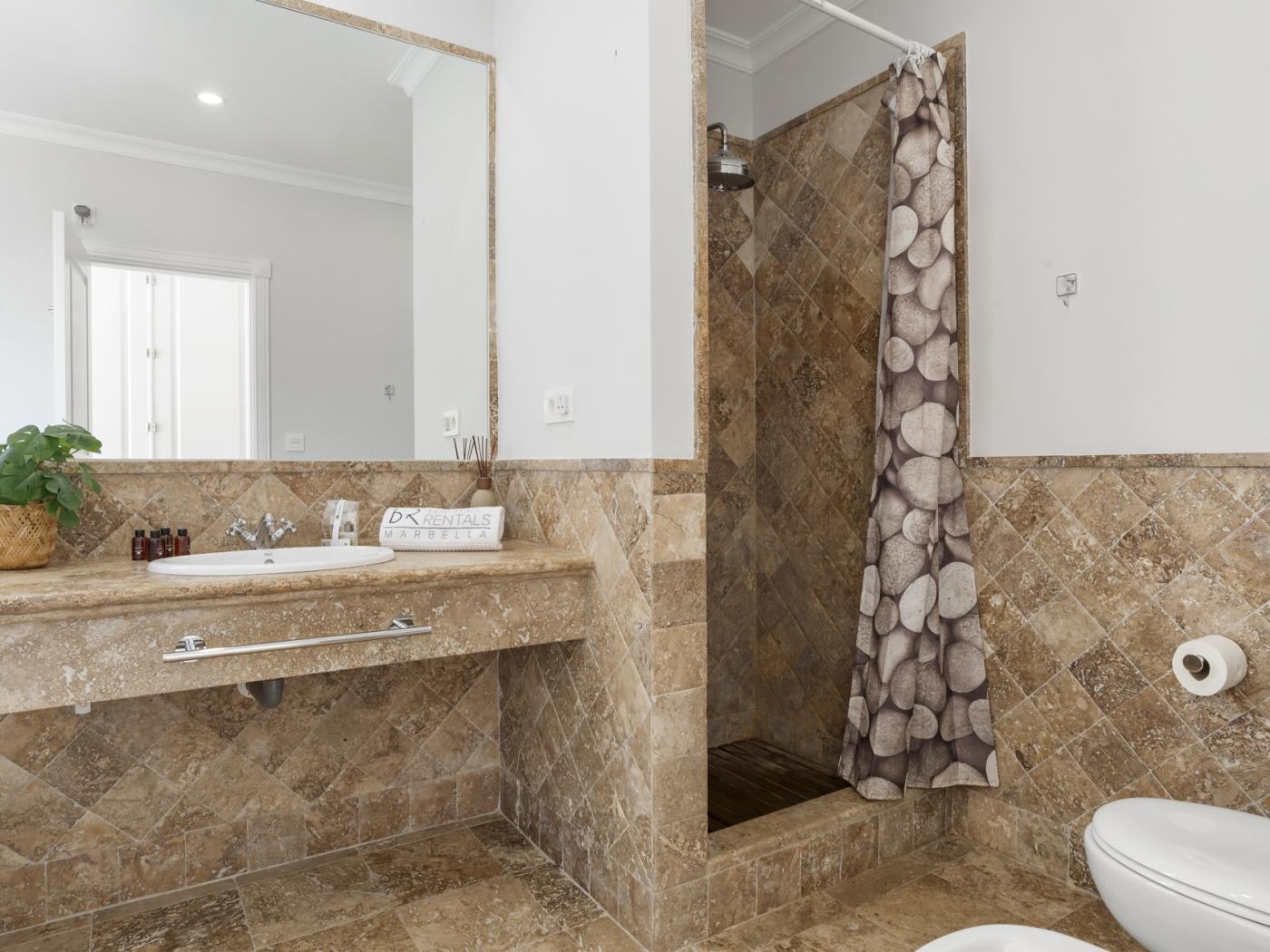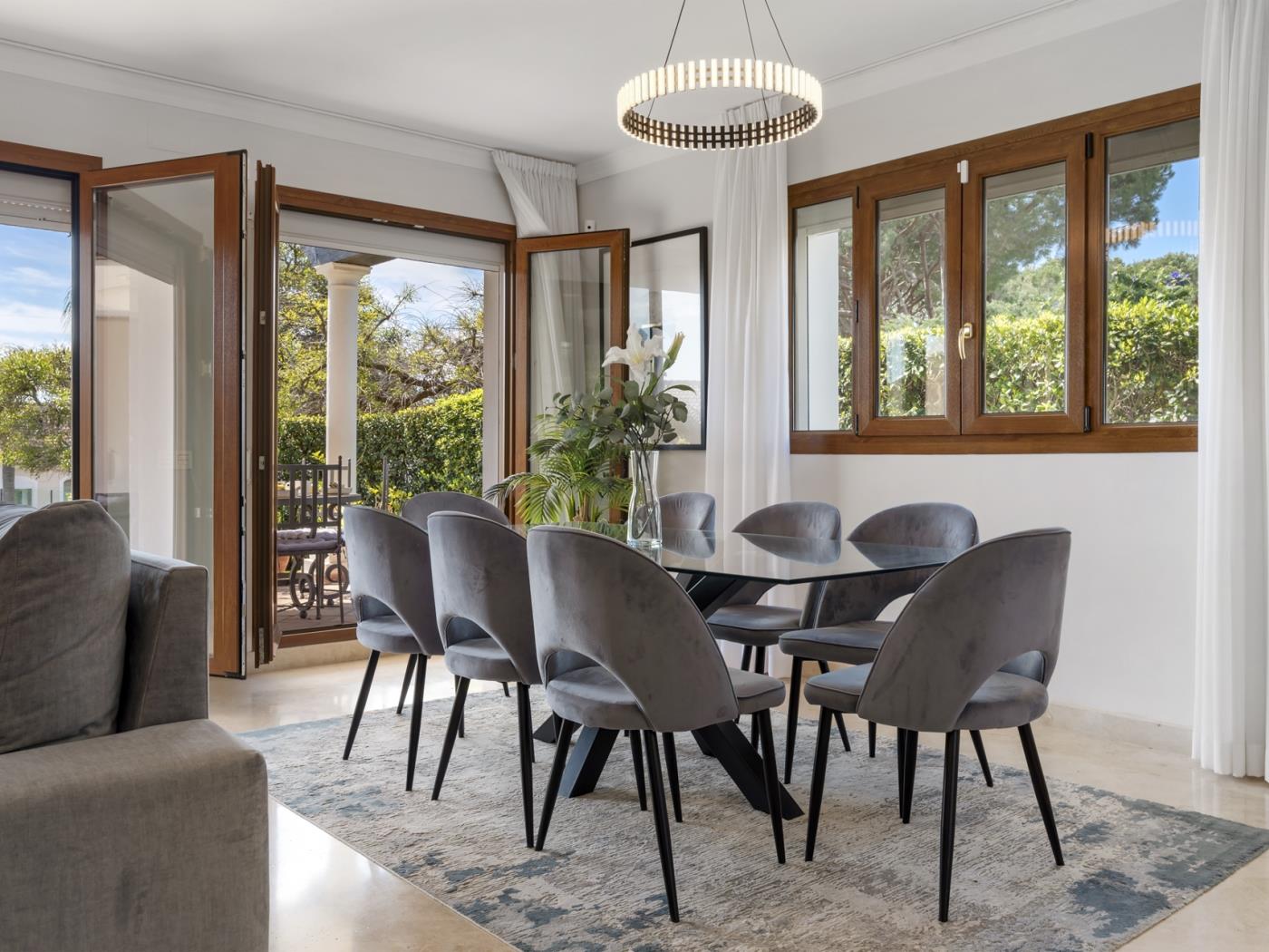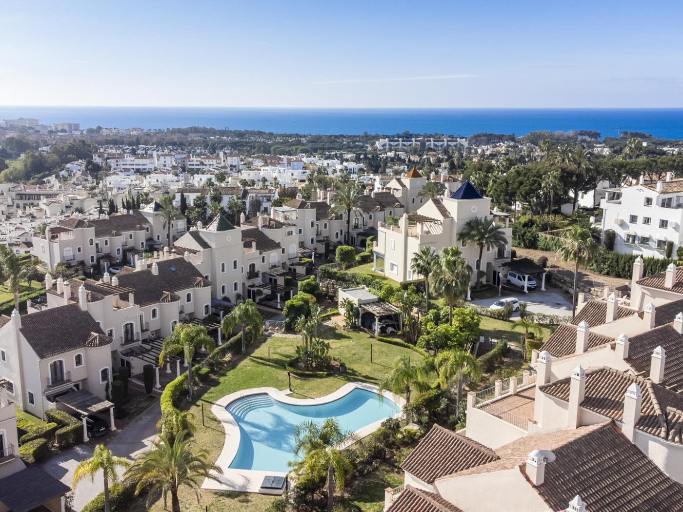 La maison peut accueillir confortablement jusqu’à six personnes, réparties dans trois grandes chambres avec salle de bain privative, ainsi qu’un salon sous combles équipé d’un canapé-lit, idéal pour un adulte ou deux enfants. Chaque pièce est décorée avec un goût contemporain et des tons neutres qui invitent à la détente. Les terrasses privées et les espaces extérieurs offrent un cadre privilégié pour profiter du climat doux de la Costa del Sol tout au long de l’année.