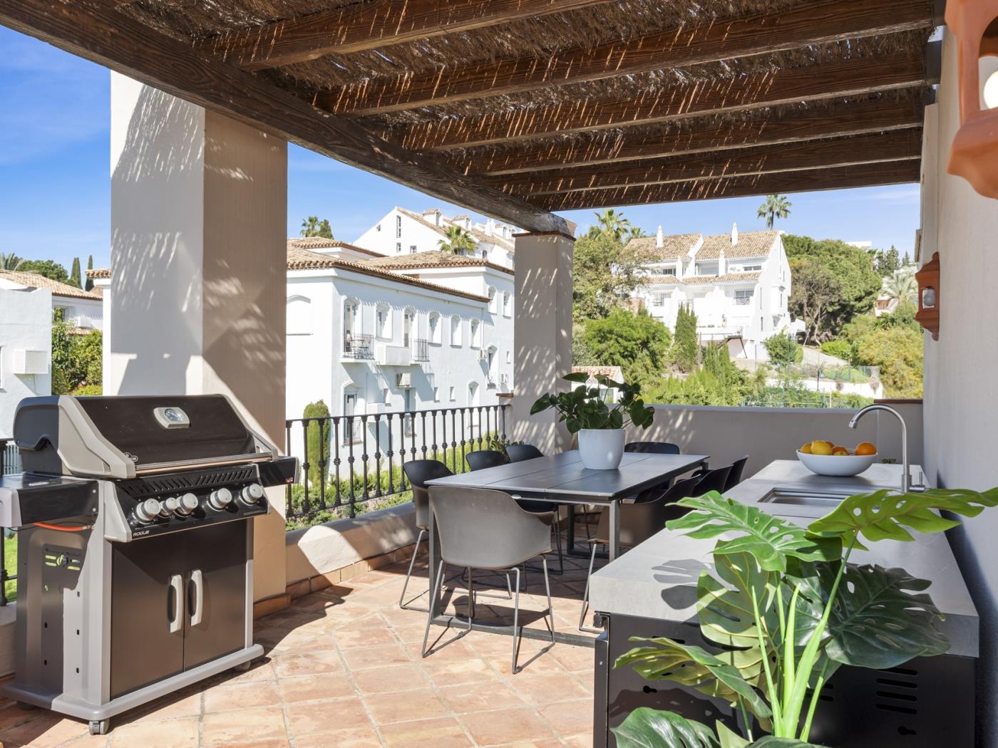Découvrez cette élégante maison mitoyenne de 180 m² située dans la résidence prisée de Paraíso Hills, sur la Nouvelle Mille d’Or d’Estepona. Répartie sur plusieurs niveaux, son design méditerranéen allie espaces généreux, lumière naturelle et atmosphère paisible — idéale pour des vacances en famille ou entre amis. La propriété dispose d’une terrasse avec vue dégagée sur la mer, d’un porche privé, d’un jardin arboré, d’une cuisine entièrement équipée, d’un salon-salle à manger avec cheminée et d’une cuisine extérieure avec barbecue, parfaite pour des repas en plein air.