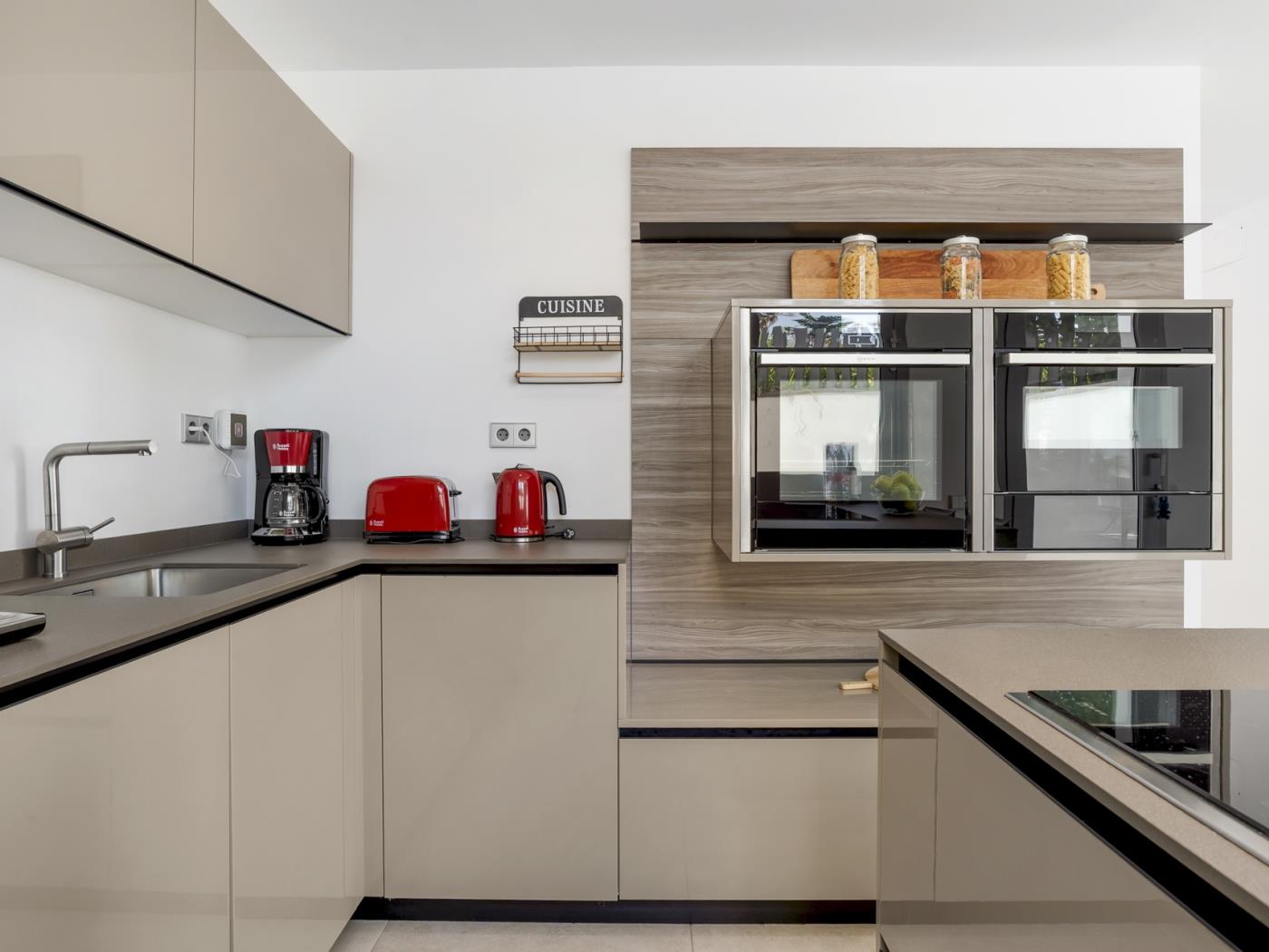 La cuisine ouverte, moderne et entièrement équipée avec des appareils de dernière génération, comprend un îlot central parfait pour cuisiner en groupe ou simplement déguster un verre de vin en admirant la mer depuis les grandes baies vitrées. Le salon, spacieux et chaleureux, s’ouvre directement sur la terrasse et la piscine, créant un espace idéal pour se détendre, lire ou partager des moments privilégiés en famille ou entre amis.